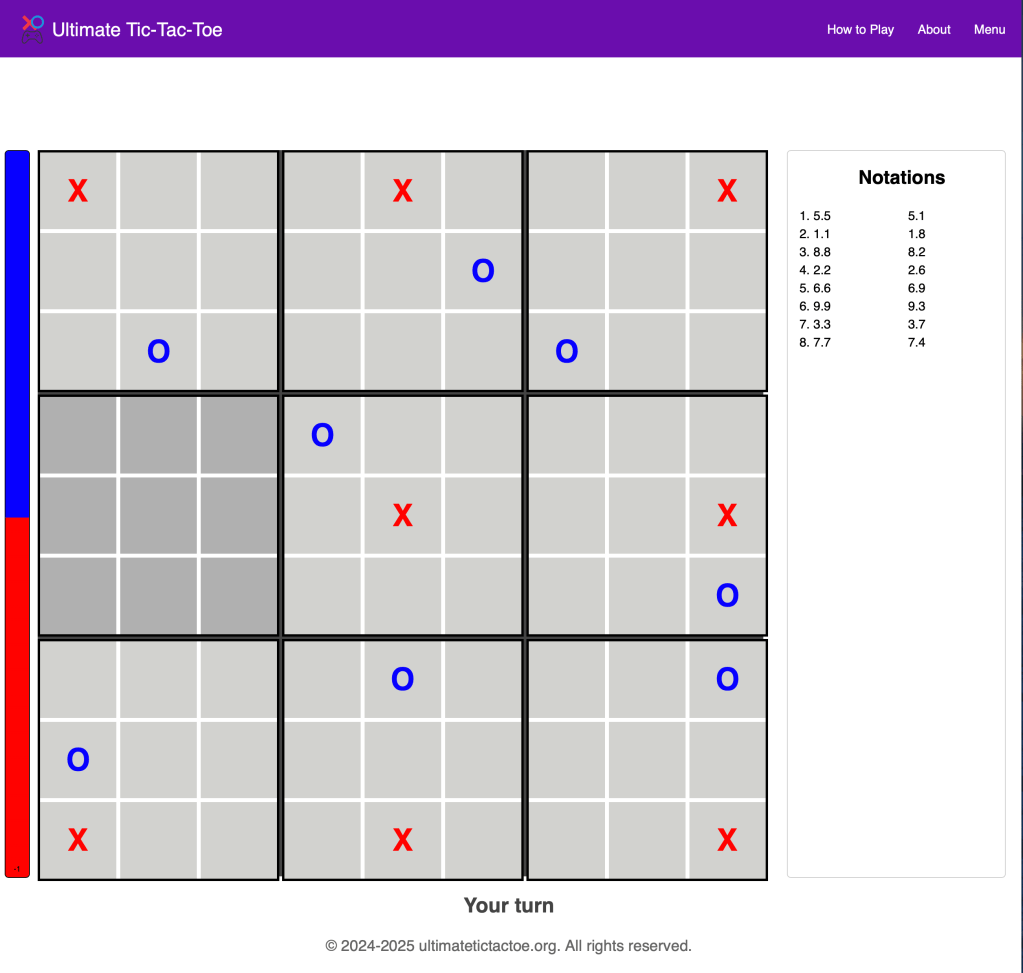 The first project I’m sharing here is an ultimate tic-tac-toe AI I wrote. It was a fun way to learn about Rust and JavaScript while building an AI for a highly complex version of tic-tac-toe. Unlike regular tic-tac-toe, ultimate tic-tac-toe is an unsolved game. Visit my website: http://ultimatetictactoe.org.